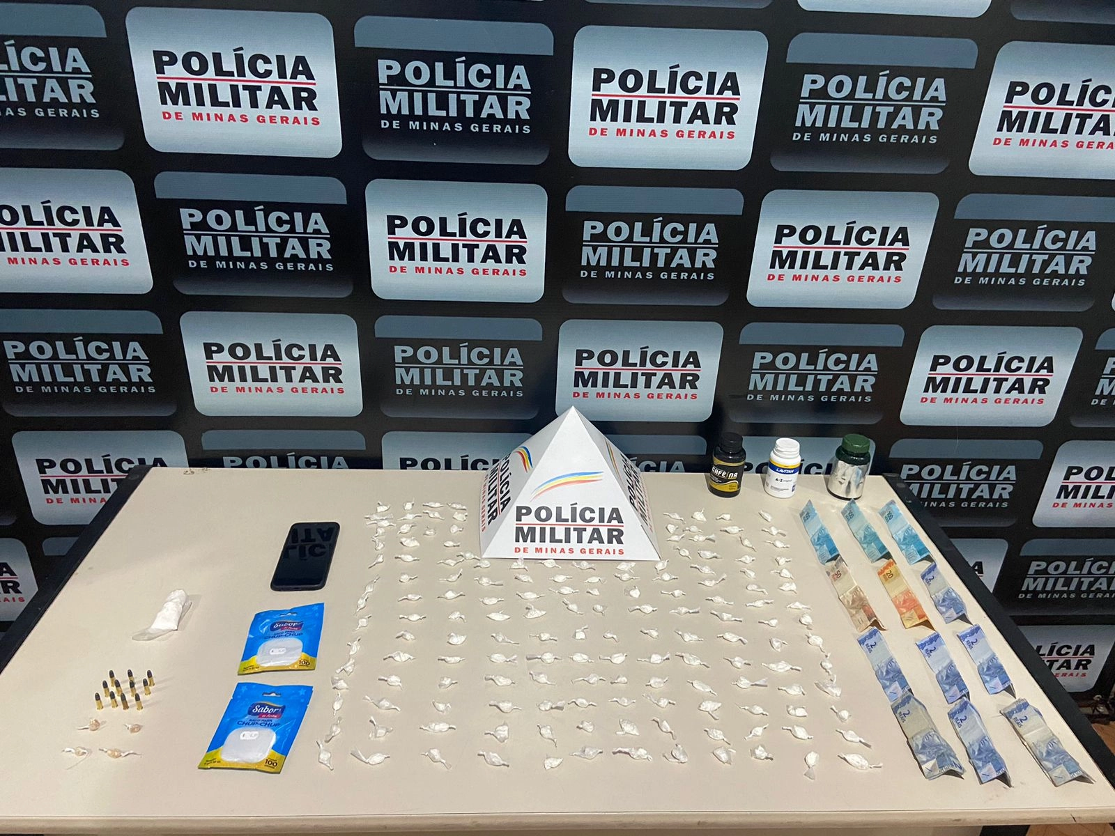 O alvo do mandado foi localizado e capturado em sua residência. Durante as diligências realizadas no imóvel, a equipe da PMMG encontrou e apreendeu os seguintes materiais: